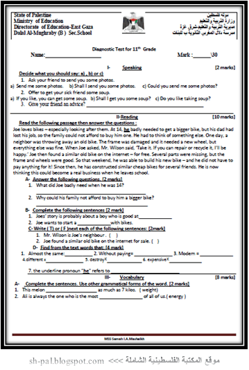 اختبار تشخيصي في اللغة الانجليزية للصف الحادي عشر المكتبة الفلسطينية الشاملة