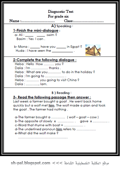 نموذج اختبار تشخيصي لمادة اللغة الانجليزية الصف السادس الفصل الاول منتديات صقر الجنوب