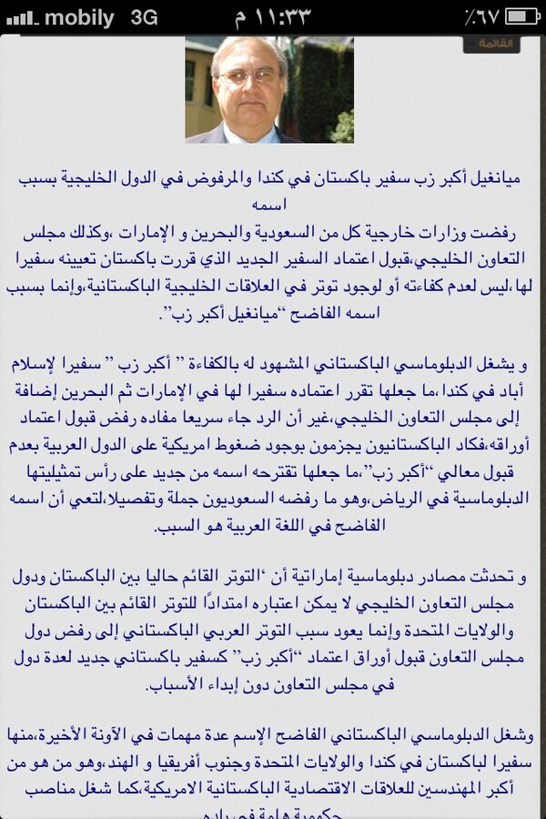 Arab Times سفير الباكستان في كندا اكبر زب يتهم الصحف ومواقع الانترنيت العربية بتدمير اسمه وينفي المزاعم المنشورة عن رفض تعيينه سفيرا في دول الخليج ويقول ان اسمه