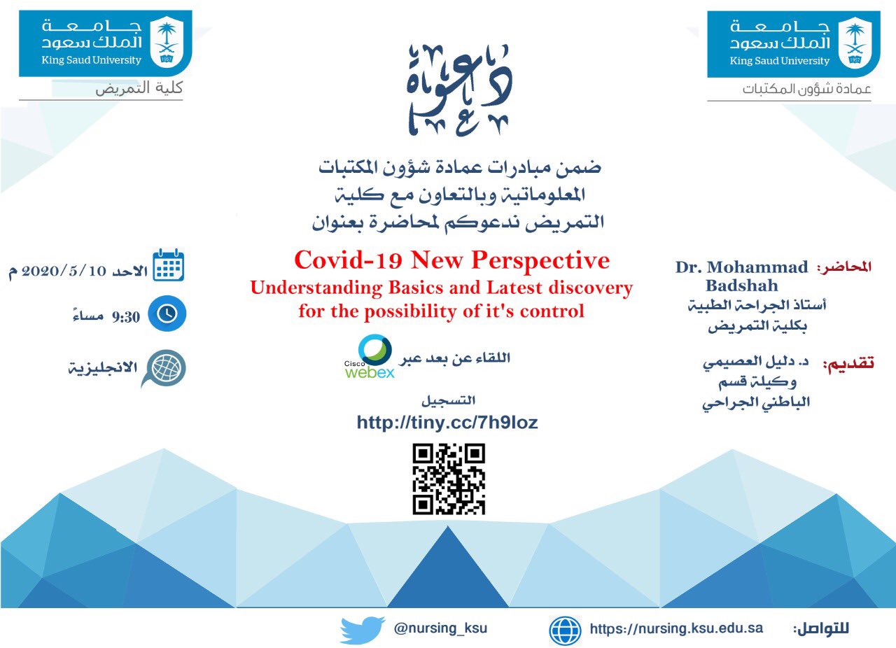 جامعة الملك سعود On Twitter تنظم عمادة شؤون المكتبات بالتعاون مع كلية التمريض غد ا الأحد محاضرة بعنوان Covid 19 New Perspective للتسجيل Https T Co Kbw68wkbim Https T Co 2ufq84s9fc