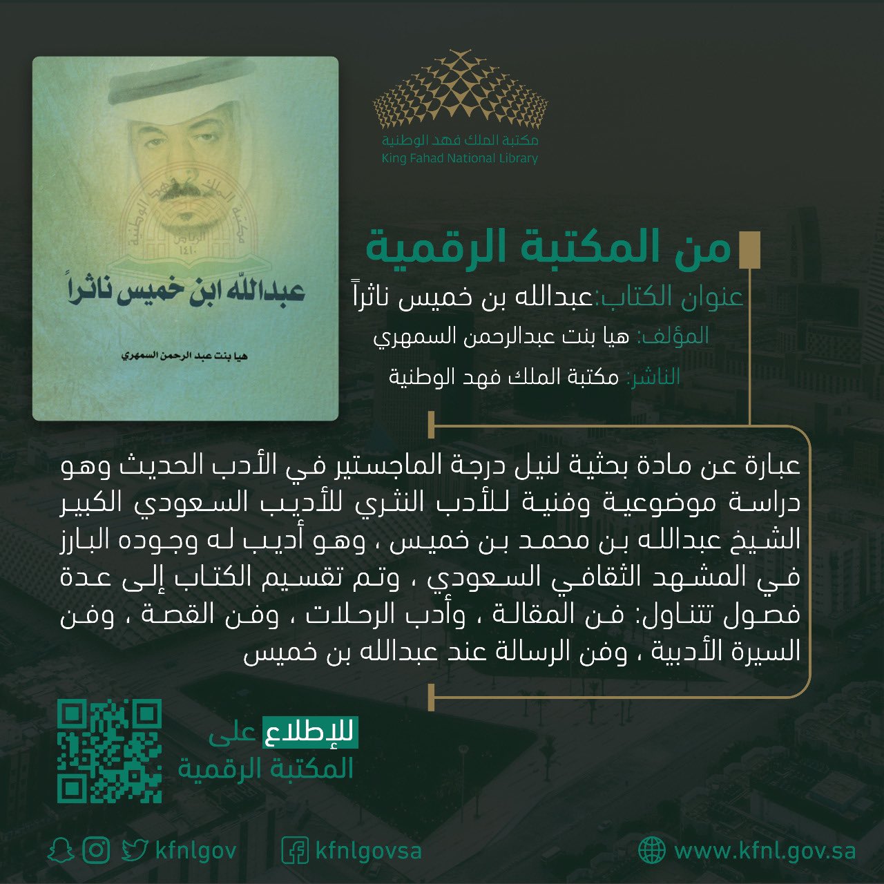 مكتبة الملك فهد الوطنية Auf Twitter من المكتبة الرقمية كتاب عبدالله بن خميس ناثرا من إصدارات مكتبة الملك فهد الوطنية وهو دراسة للأدب النثري للأديب السعودي عبدالله بن خميس استمتعوا بقراءته عبر الرابط التالي