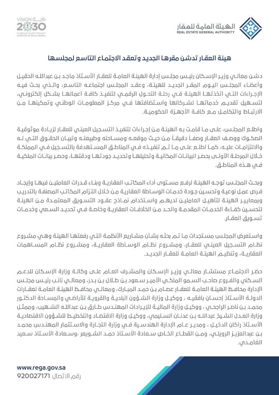 الهيئة العامة للعقار On Twitter خبر صحفي هيئة العقار تدشن مقرها الجديد وتعقد الاجتماع التاسع لمجلسها