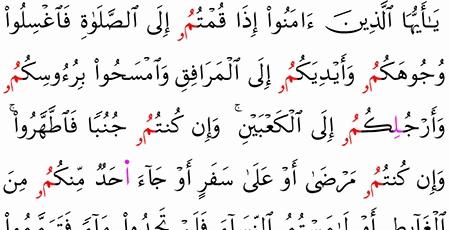 013585 يا أيها الذين آمنوا إذا قمتم إلى الصلاة فاغسلوا وجوهكم وأيديكم إلى المرافق وامسحوا برءوسكم وأرجلكم إلى الكعبين وإن كنتم جنبا فاطهروا وإن كنتم مرضى أو على سفر أو جاء
