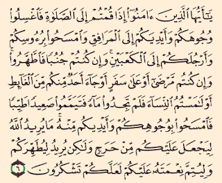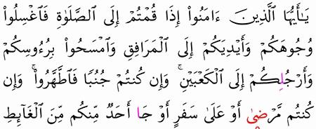 013585 يا أيها الذين آمنوا إذا قمتم إلى الصلاة فاغسلوا وجوهكم وأيديكم إلى المرافق وامسحوا برءوسكم وأرجلكم إلى الكعبين وإن كنتم جنبا فاطهروا وإن كنتم مرضى أو على سفر أو جاء